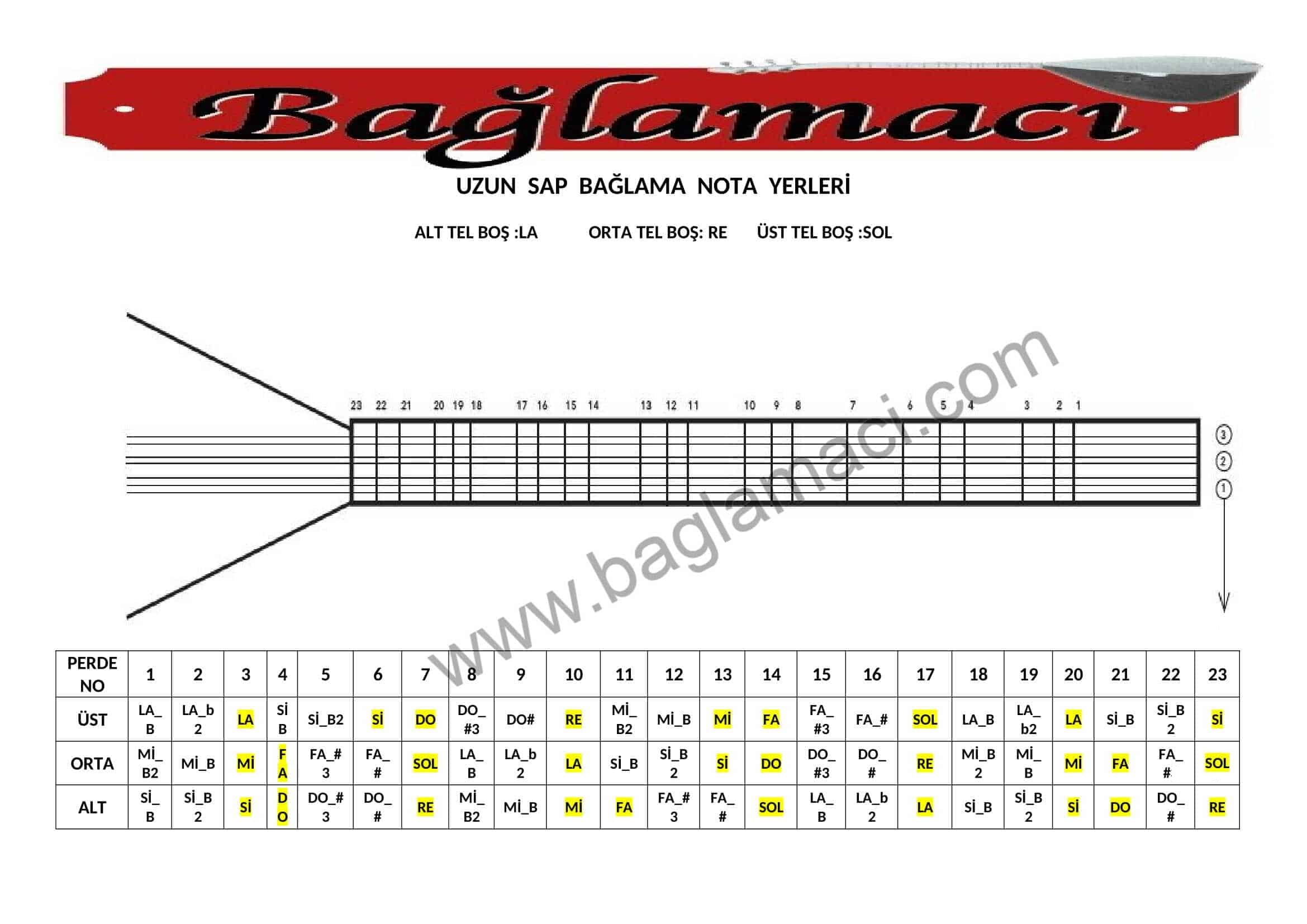 Not: Uzun Sap Nota Kara Düzen bağlamayı bağlama düzeni akort etmek için en üst teller G harfine çekilir. Karar sesimiz Mi olur